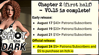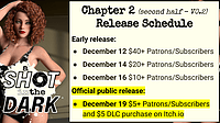- December 10, 2022 by ViM Studios7#A Shot in the Dark, #Preview, #Trailer, #Early Release, #Release ScheduleEarly Release of Chapter 2 - second half (V0.2) of A Shot in the Dark will start on Monday, December 12 with an official public release scheduled for Monday, December 19 . December 12 - $40+ Patrons/S... Continue reading